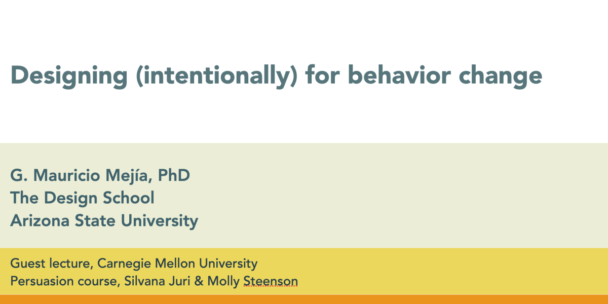 Prof. G. Mauricio Mejía was invited to visit Silvana Juri & Molly Steenson's class on Persuasion. He talked about approaches to design for behavior change discussing concepts such as rhetoric, behavioral economics, and service design. March 31, 2021. Pittsburg, PA: Carnegie Mellon University (held online).