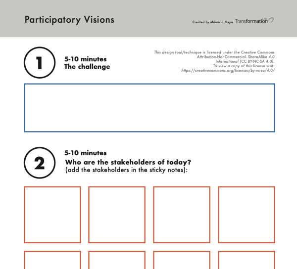 In the Transformation Lab, we have been using diverse methodological tools to support strategic design practices. We have developed a tool for our regular visioning activities. We call it "participatory visions." This tool has been refined in several iterations from activities with partners, clients, and students.