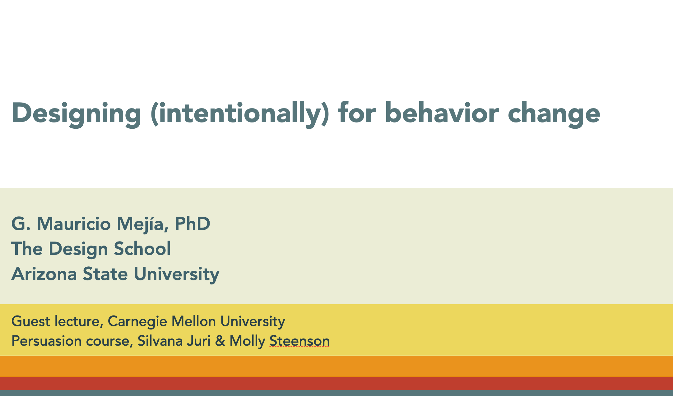 Prof. G. Mauricio Mejía was invited to visit Silvana Juri & Molly Steenson's class on Persuasion. He talked about approaches to design for behavior change discussing concepts such as rhetoric, behavioral economics, and service design. March 31, 2021. Pittsburg, PA: Carnegie Mellon University (held online).