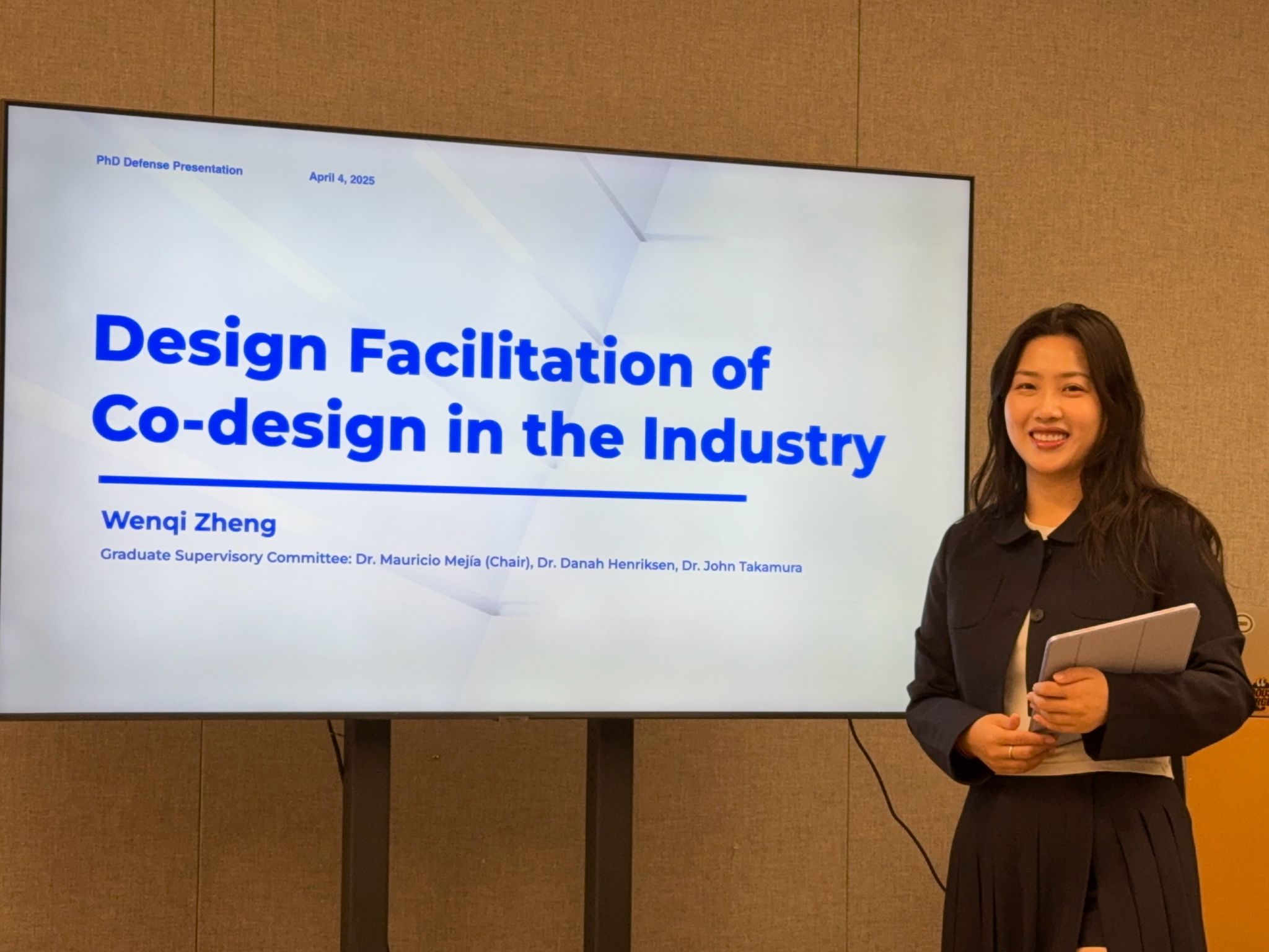 Doctoral candidate Wenqi Zheng successfully defended her Ph.D. dissertation on Friday, April 4th. Congratulations! Her research made contributions to the research area of design facilitation. She identified design facilitation practices and styles in the literature and case studies from professional practice.