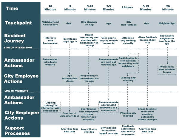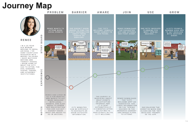 This was a sponsored course (Strategic Design Futures, graduate elective). PEI is a non-profit organization that promotes a culture of innovation in Phoenix aiming to contribute to the economy with research, technology development, and entrepreneurship. The students designed strategies and services for the future (2030) and the present related to resident engagement in Greater Phoenix. The goal was to explore city managers’ need to engage residents from their communities to socialize initiatives, get residents to participate in the decision-making process, and continuously learn how residents are affected by policies and services. With the mentorship of the instructor and the sponsor, students explored, ideated, and prototyped products, services, policies, and or systems that would help residents better engage in their local government processes and services.